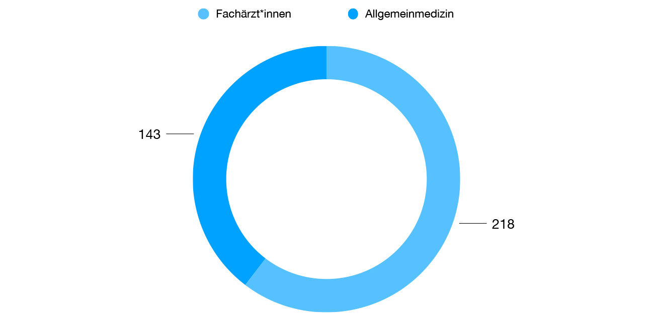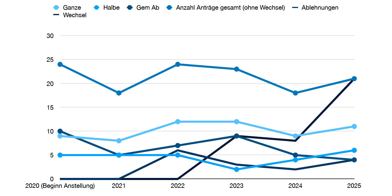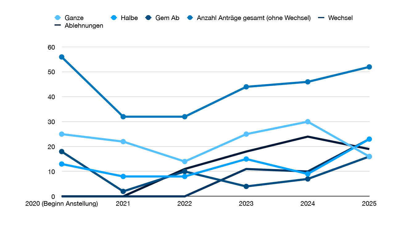 Im Bereich der Allgemeinmedizin wurden 2025 in Summe 21 Anträge auf Anstellung eingebracht. Davon entfielen 4 Anträge auf die gemeinsame Abdeckung, 6 auf eine Anstellung mit Aufstockung um eine halbe Stelle und 11 auf eine Anstellung mit Aufstockung um eine ganze Stelle. Zusätzlich vermerkten wir weitere 21 Anträge auf Anstellungswechsel.