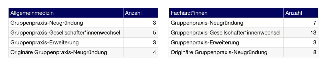 Im Rahmen der Ausschreibungen 2025 wurden folgende Gruppenpraxen ausgeschrieben und in den Bereichen der Allgemeinmedizin bzw. der Fachärzt*innen bearbeitet: