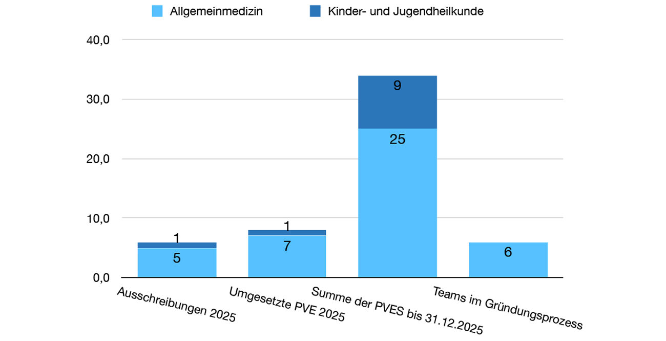 2025 eröffneten sieben PVEs im Fachbereich Allgemeinmedizin bzw. Allgemein- und Familienmedizin und eine PVE in Form eines kindermedizinischen Zentrums. Zum Stichtag 31. Dezember 2025 verstärkten insgesamt 34 PVEs mit erweiterten Öffnungszeiten und multiprofessionellen Teams die Patient*innenversorgung.
